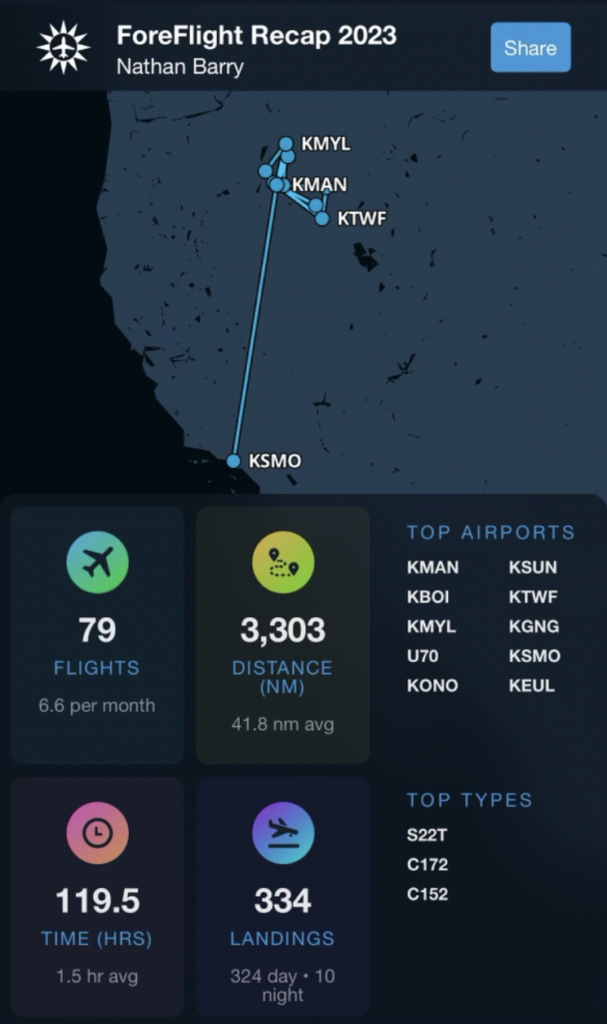 ForeFlight, the app most pilots use to track and plan their flights, does a nice recap at the end of the year (Spotify wrapped for pilots). Here’s mine: