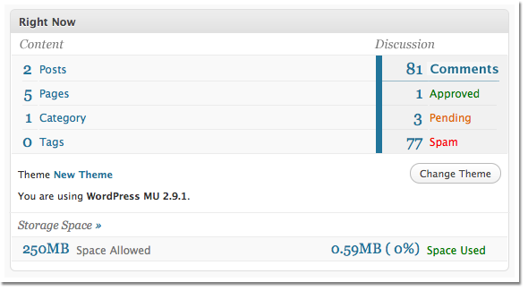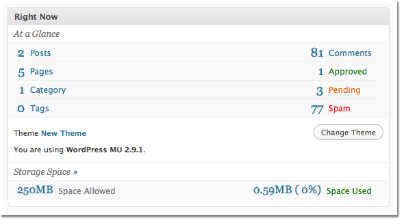 In the WP UI group we are currently discussing how to improve the “At a Glance” module on the dashboard to make it more clear. The problem is that comments is not differentiated at all from the rest of the sections so users tend to think that “Pending” relates to “Categories”. This can be seen in the current UI below.