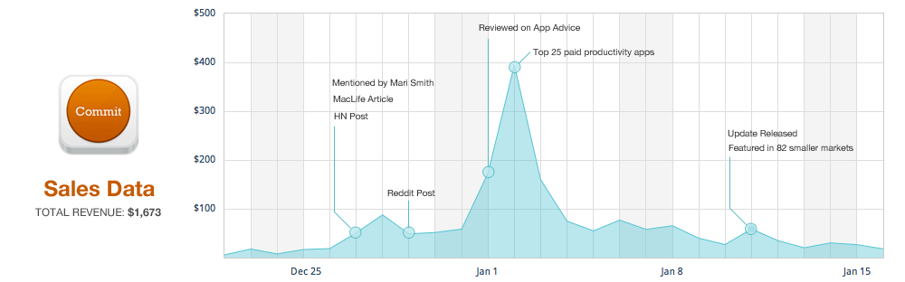 Now commit gets around 30-40 sales per day. As of today it has sold $1,673. Not a huge number, but it is a lot more than I expected. I’m pursuing other options to increase that number. Here is the graph with event marked on it.