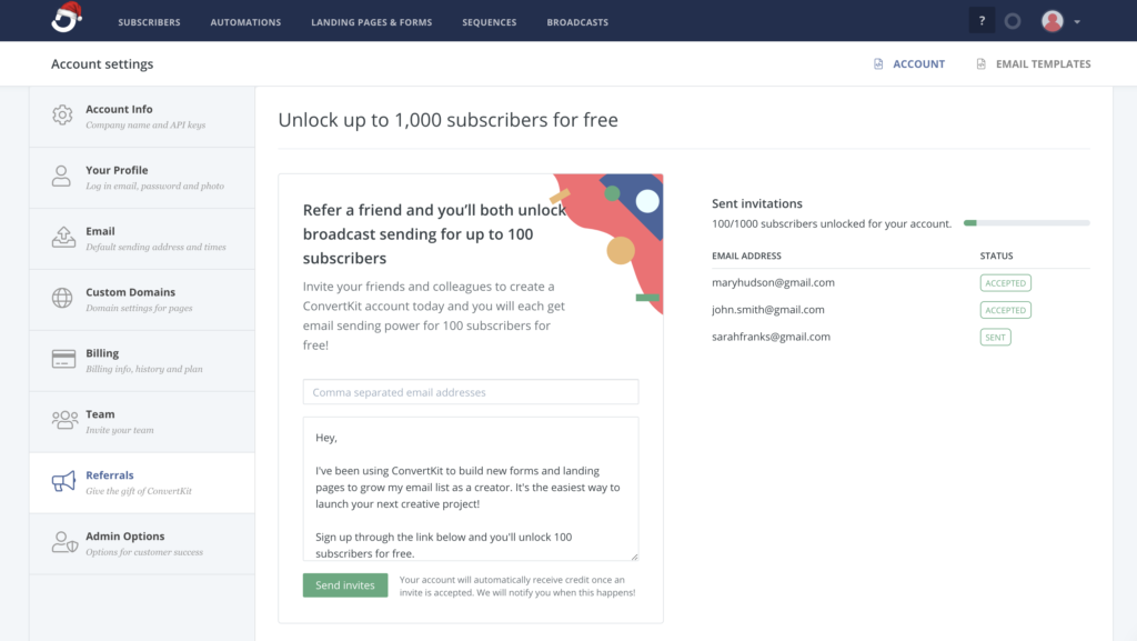Once you have your first subscribers you’ll want to send them emails. You can either upgrade to a paid account for $29/month or if you invite a friend you’ll unlock subscriber management (tags, segments, and more!) and the ability to send broadcast emails for up to 100 subscribers.