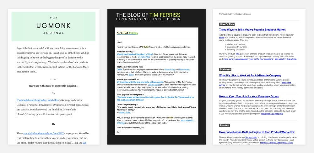 Tim Ferriss runs one of the largest email newsletters on the internet (it’s powered by ConvertKit!) and he built it through curation. Each Friday he sends out an email with his favorite quotes, content, and purchases. Sometimes he includes his own content, but it’s most often a curated list.