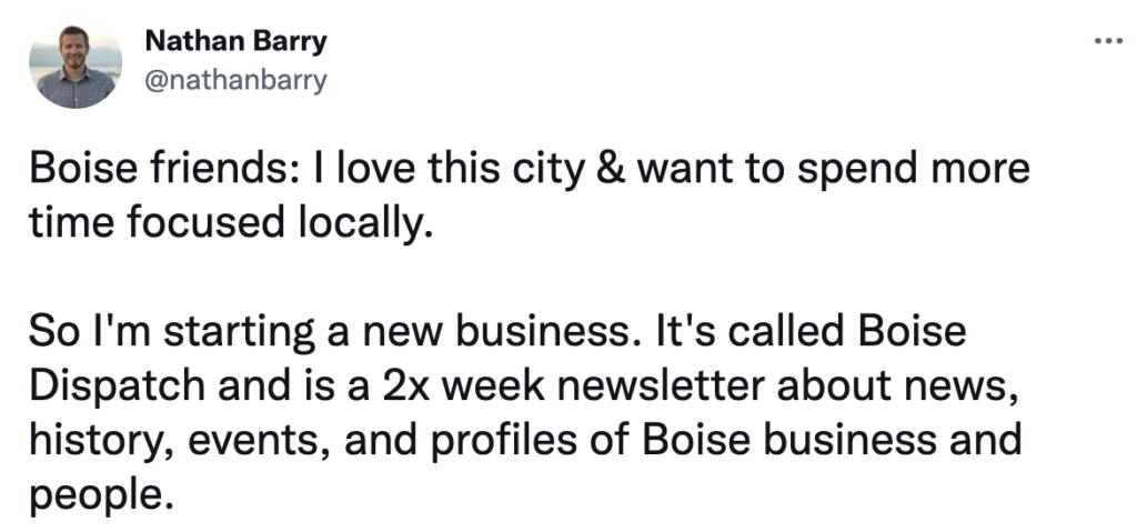 In December 2020 I was hanging out with my family at a cabin in the mountains brainstorming what a local newsletter for Boise could look like. I’ve been a fan of what Andrew Wilkinson has done with Capital Daily for Victoria, BC and I love Boise at least as much as he loves Victoria.