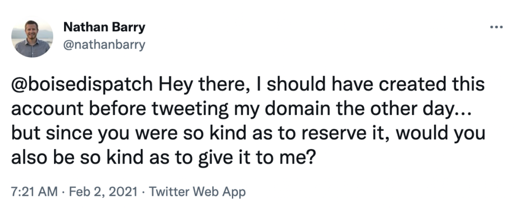 Then I made a rookie move… I had bought the domain, but not yet set up my Twitter account. Someone else registered it right away. I never found out who it was and any attempts to contact them didn’t get a response.