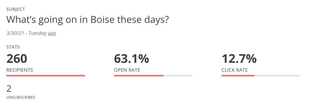 I’m very fortunate to be able to launch a venture like From Boise, build it to 10,000 subscribers, and not have it take up much time at all (I spend an hour or two a week on it at most). Hopefully this gives you some insight into what it takes to build a similar venture.