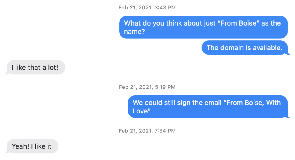 The next night Hilary and I had friends over for dinner and I ran the ideas past them. Everyone liked “From Boise, With Love” but it wasn’t quite right. Then my friend Kara suggested, “Call it ‘From Boise’ it’s simpler.”
