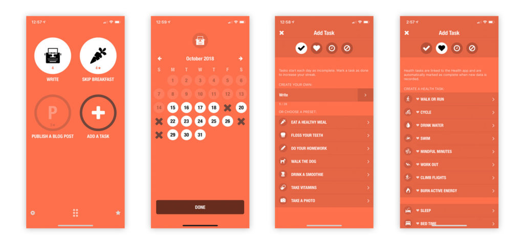 Streaks follows the same principle, but has a lot more functionality. First you define a task you want to do every day (mine is writing), and then set the your interval, icon, and any reminders.